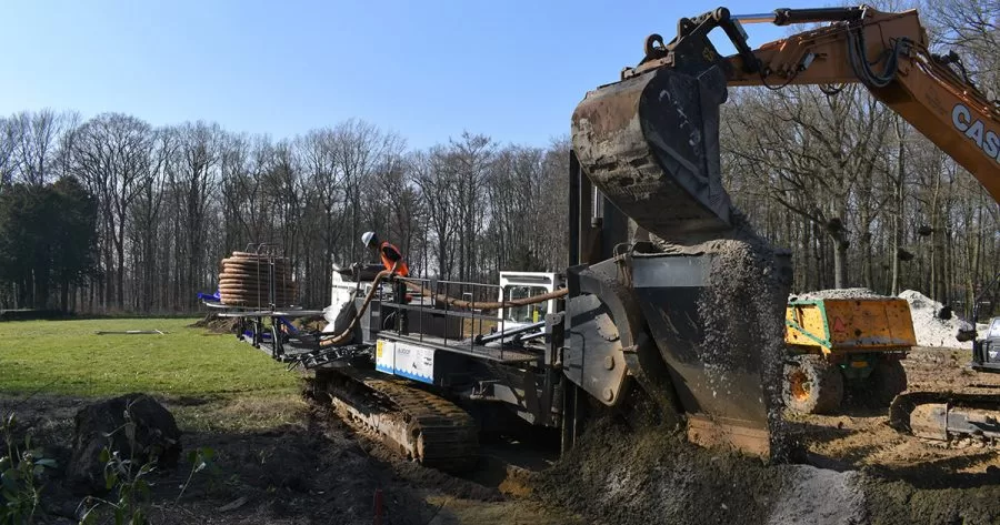 Voor de ontwikkeling van grote bouwoppervlakten en lange kabel- en leidingtracés is het toepassen van horizontale bemaling een zeer geschikte methode om de werkzaamheden in den droge uit te voeren. Door middel van onze drainagemachines wordt een drain tot een diepte van maximaal