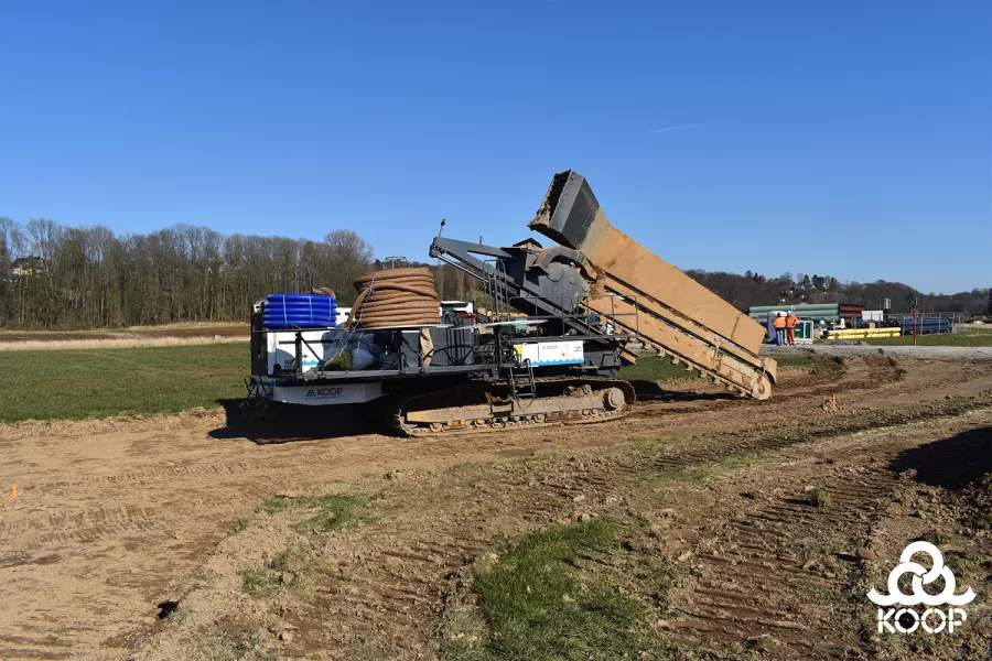 7,8 meter onder het maaiveld geïnstalleerd. Om de grondwatertoestroming in slecht doorlatende gronden te bevorderen wordt de drainsleuf aangevuld met drainagezand.