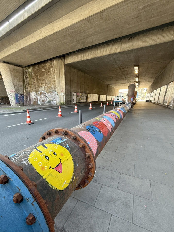 Wat begon als een puur technische maatregel voor waterbeheersing, werd een kleurrijk hoogtepunt in het stadsbeeld van Keulen: de “Keulse rups” – een 52 meter lang kunstwerk onder de Auenweg-brug, ontworpen door bijna 200 kinderen van de KGS Vietorstraße.