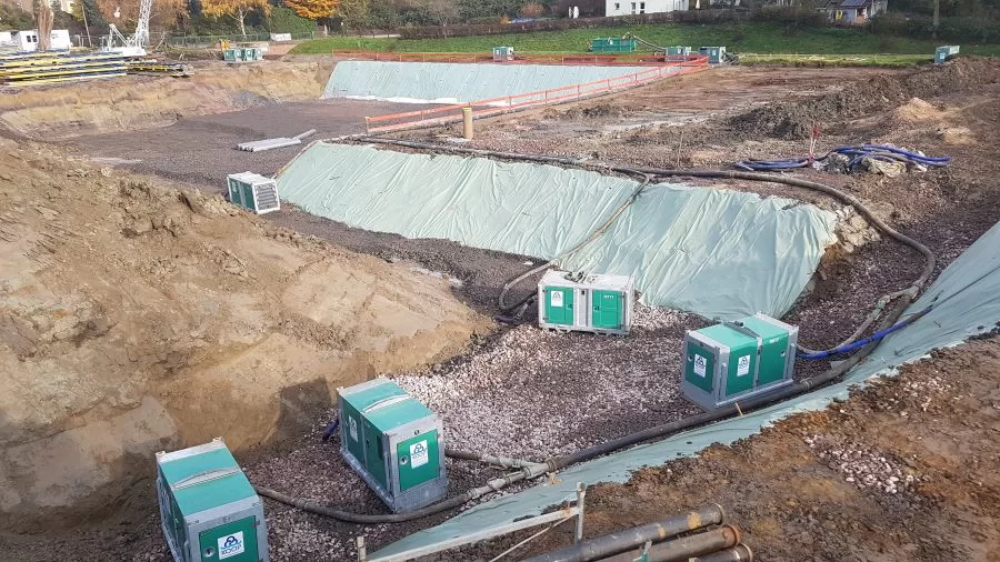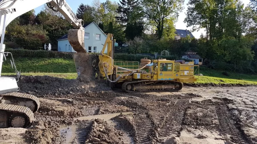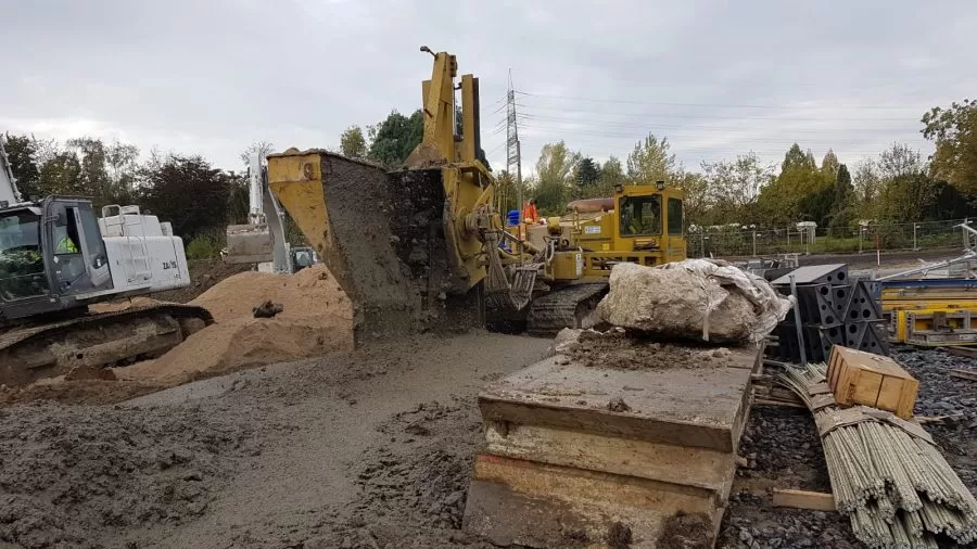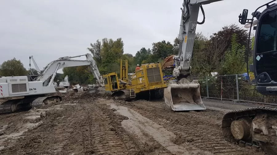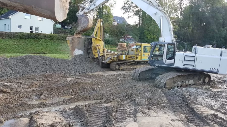 In het kader van de herverzadiging van de Mühlenbach bouwt de Emschergenossenschaft een regenwateroverloopbekken (RÜB) op de stadsgrens tussen Mülheim a. d. Ruhr en Essen-Frohnhausen. Het zal een capaciteit hebben van bijna 15.000 m³. Daarnaast worden op verschillende niveaus riolen gebouwd voor de scheiding van afvalwater en regenwater. In totaal hebben ze een lengte van bijna 2.000 m met een diameter tot 3,60 m. In opdracht van het bedrijf Helmut Uhrig Straßen und Tiefbau GmbH voert Koop Wasserbau GmbH de ontwateringswerkzaamheden uit. Daarbij is al 2.320 m diepe drainage ingefreesd voor de stormwatertank en de grachten. Ook werden 14 diepe putten aangelegd en 300 m filters doorgespoeld. Ondertussen waren er 18 pompen in gebruik. Het project loopt volgens de planning tot eind 2022.
