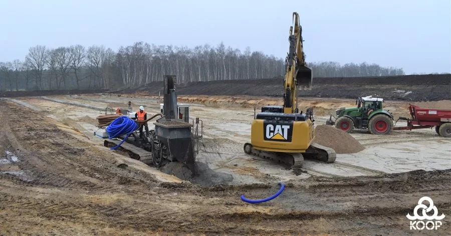 Voor de ontwikkeling van het industrieterrein in Dorsten/Wulfen hebben wij als Koop in het 1e deel ca. 900 m drainage gefreesd op 3,50 m diepte voor de aanleg van een bergbezinkbassin inclusief leidingsleuf voor de rioolaanleg.